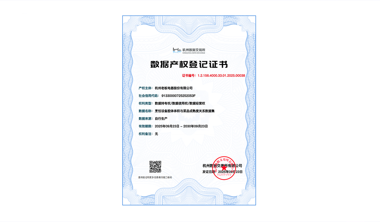 老板电器获得厨电烹饪领域首张数据产权登记证书