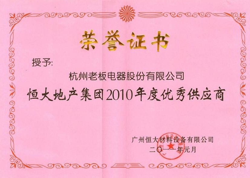 近日,恒大地产集团最新颁布了“2012年度优秀供应商”名单,老板电器再次凭借高端的品牌定位、良好的产品品质以及优秀的服务质量位列榜首,这也是继 2010年度和2011年度获得恒大地产“优秀供应商”称号之后,再次获得该殊荣。至此,杭州老板电器已连续三年荣登恒大地产“优秀供应商”之列。本次评 选是恒大地产集团根据《材料设备供应商年度综合评估方案及细则》,从供应商的品牌形象、综合实力、产品品质、供货及时性、现场配合以及售后服务等多方面进 行的综合评定。