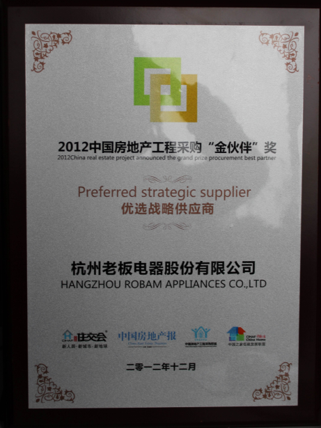 12月16日, 在中国房地产报和中国房地产工程采购联盟主办的CIHAF2012第三届中国房地产采购“金伙伴”奖颁盛典上,有中国房地产工程采购领域的“奥斯卡”之称 的2012中国房地产工程采购“金伙伴”奖隆重揭晓,老板电器从众多参赛企业中脱颖而出,荣膺优选战略供应商奖。此外,全球最大的专业住宅开发商万科集团 高层领导、厨房电器行业领军品牌老板电器董事副总裁赵继宏与其他八家企业高管还一起荣获价值链影响力人物。